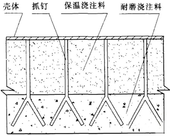 (3)采用固定抓釘和高溫燒結磚的澆注料結構形式