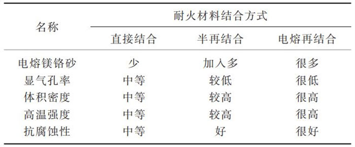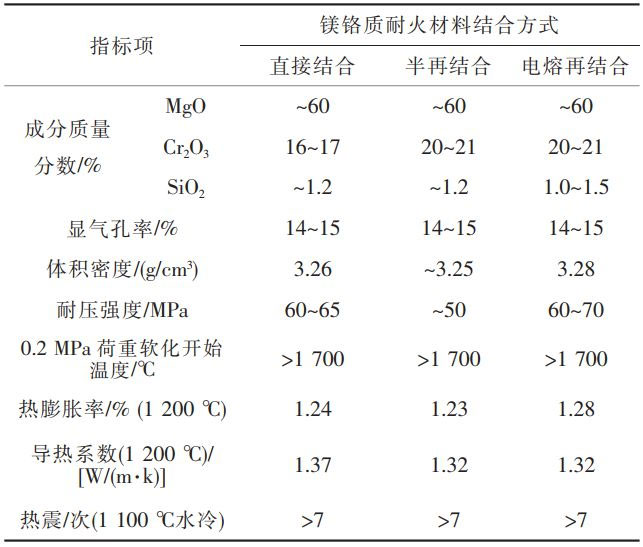 根據(jù)鎂鉻質(zhì)耐火材料的結(jié)合形式的不同,包括直接結(jié)合、半再結(jié)合、電熔再結(jié)合等鎂鉻質(zhì)耐火材料。其中,直接結(jié)合鎂鉻質(zhì)耐火材料是以高純燒結(jié)鎂砂和鉻鐵礦為原料,將電熔鎂砂與鉻礦直接燒結(jié);半再結(jié)合鎂鉻質(zhì)耐火材料是以電熔鎂鉻砂作屬粒,加入部分鉻礦和鎂砂或燒結(jié)合成鎂鉻料作細(xì)粉,高溫?zé)Y(jié)而成;電熔再結(jié)合鎂鉻質(zhì)耐火材料是將鉻礦與電熔鎂砂在電爐中電熔,制得電熔鎂鉻砂,再高溫?zé)Y(jié)而成。3類鎂鉻質(zhì)耐火磚材料特性對(duì)比,見表1。