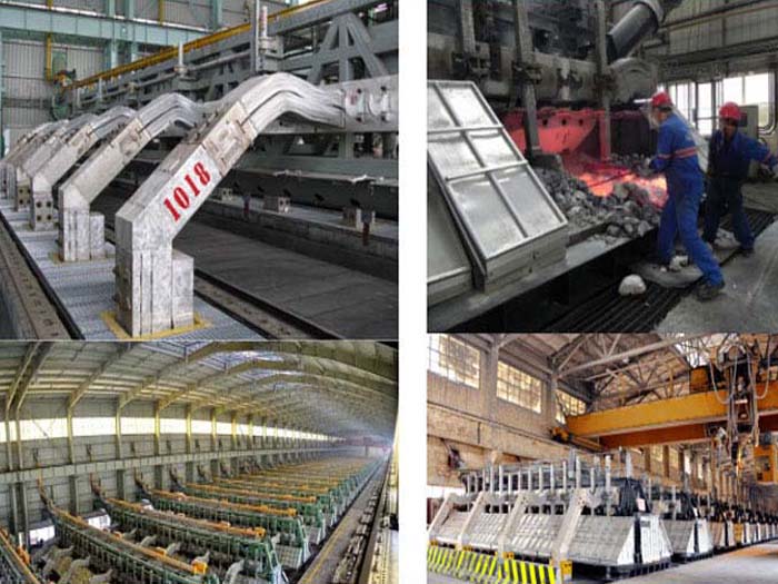 鋁電解槽通常為矩形鋼殼,內襯碳磚。電解槽中懸有一碳陽ji,其碳質槽底為陰ji。電解還原出來的金屬鋁熔體沉積于槽底陰ji。陽ji放出的氧與碳陽ji反應生成CO與CO2。槽內電解質與鋁保持熔融狀態,隔一定時間從槽內放出鋁液,并向槽內加入一定量的Al2O3與冰晶石(3NaF.AlF3)等。電解溫度為900~1000℃。