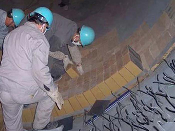 受到的是壓、拉、扭、剪的綜合機(jī)械應(yīng)力。窯的轉(zhuǎn)動(dòng),筒體橢圓度,襯磚和筒體之間及磚與磚之間的擠壓、扭動(dòng)、窯筒體變形,都會(huì)在磚襯之間產(chǎn)生機(jī)械應(yīng)力。當(dāng)筒體與輪帶間隙較大,使窯筒體橢圓度增大,襯磚受交變應(yīng)力增加,輪帶部位所受的機(jī)械應(yīng)力更為嚴(yán)重。我廠在更新磚后曾發(fā)生窯筒體彎曲,劇烈振動(dòng)加上窯襯時(shí)有局部過熱,引起胴體變形擠壓內(nèi)襯,再之托輪調(diào)整費(fèi)時(shí)較長(zhǎng),在距窯前6m整三號(hào)輪帶處發(fā)生紅窯,耐火磚在一個(gè)部位大面積脫落,挖補(bǔ),托輪調(diào)整正常窯體不再振動(dòng),此次之后再未發(fā)生紅窯現(xiàn)象。